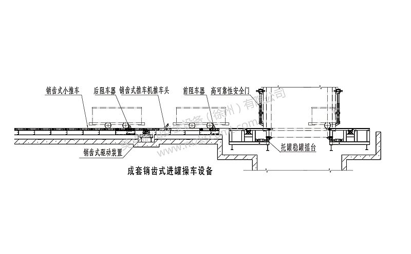 操車系統(tǒng)成套技術(shù)設(shè)備是由銷齒推車機(jī)、搖臺(tái)(搭接搖臺(tái)、托罐搖臺(tái)、托罐鎖罐搖臺(tái))阻車器、安全門、液壓系統(tǒng)、電控及信號(hào)系統(tǒng)等部分組成。