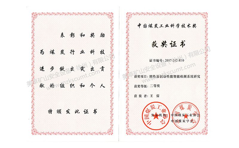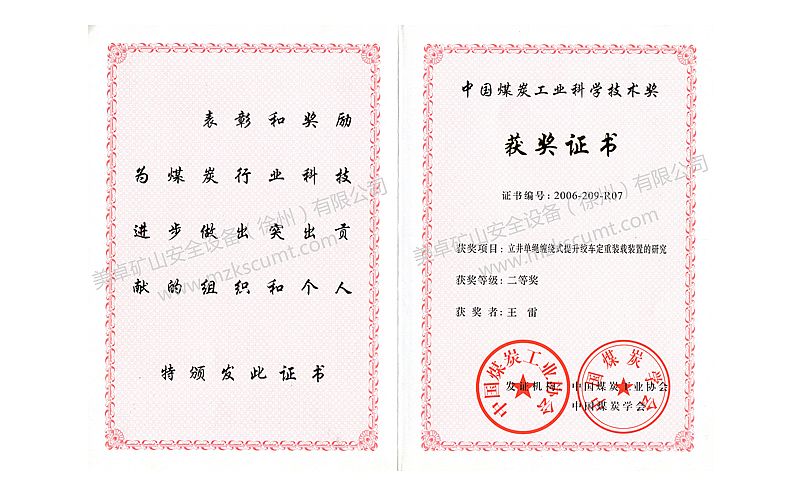 中國(guó)煤炭工業(yè)科學(xué)技術(shù)獎(jiǎng)二等獎(jiǎng)